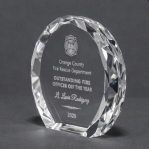 Honor bravery and leadership with the Outstanding Fire Officer of the Year Crystal Plaque, a stunning circular award crafted for distinction. This faceted crystal piece features a transparent body with precision engraving and a bold emblem of the Orange County Fire Rescue Department. The award is designed to reflect light beautifully, creating a